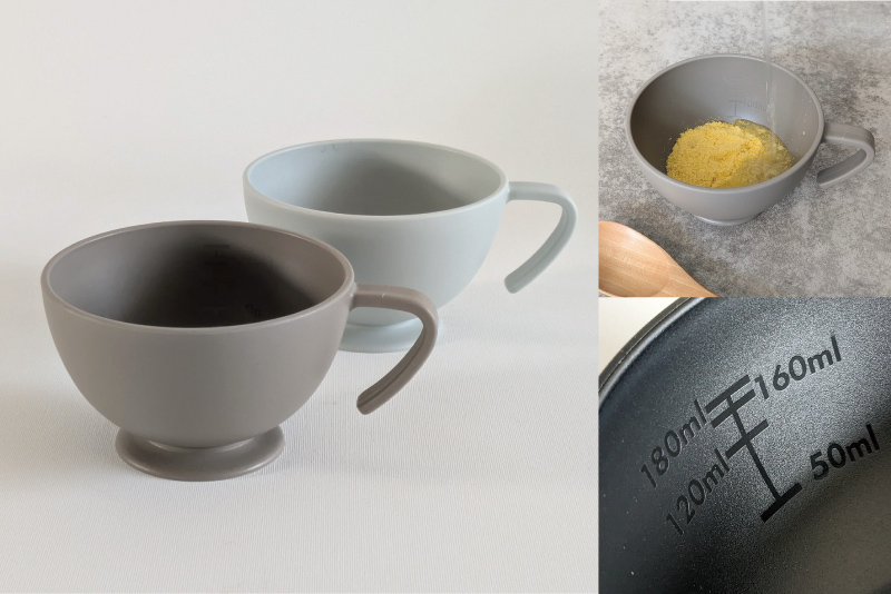 インスタントスープ、お味噌汁などの使用湯量のメモリ入り。ハンドルがついているのでお子様でも使い易い。