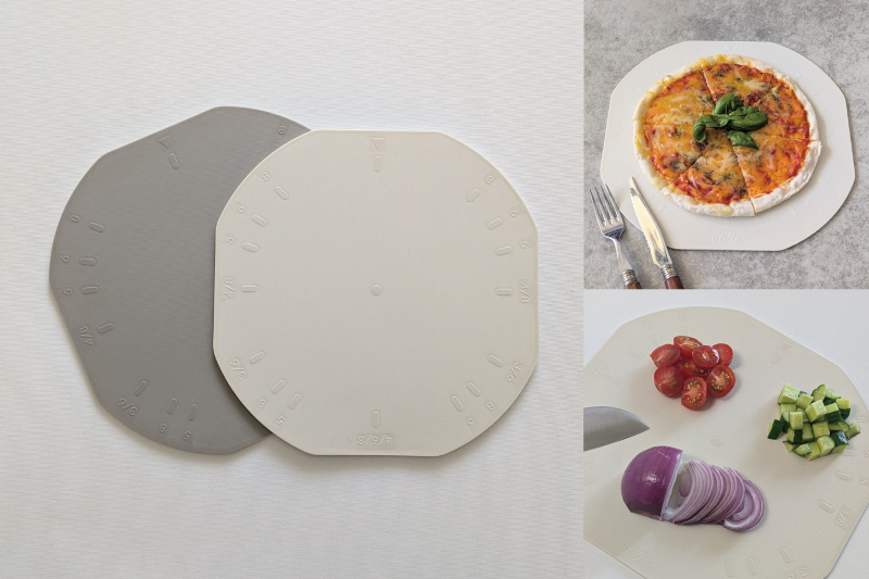 盛り付け皿としても使える均等カットメモリ入りのまな板。四方が平らになっているので立て掛けられます。